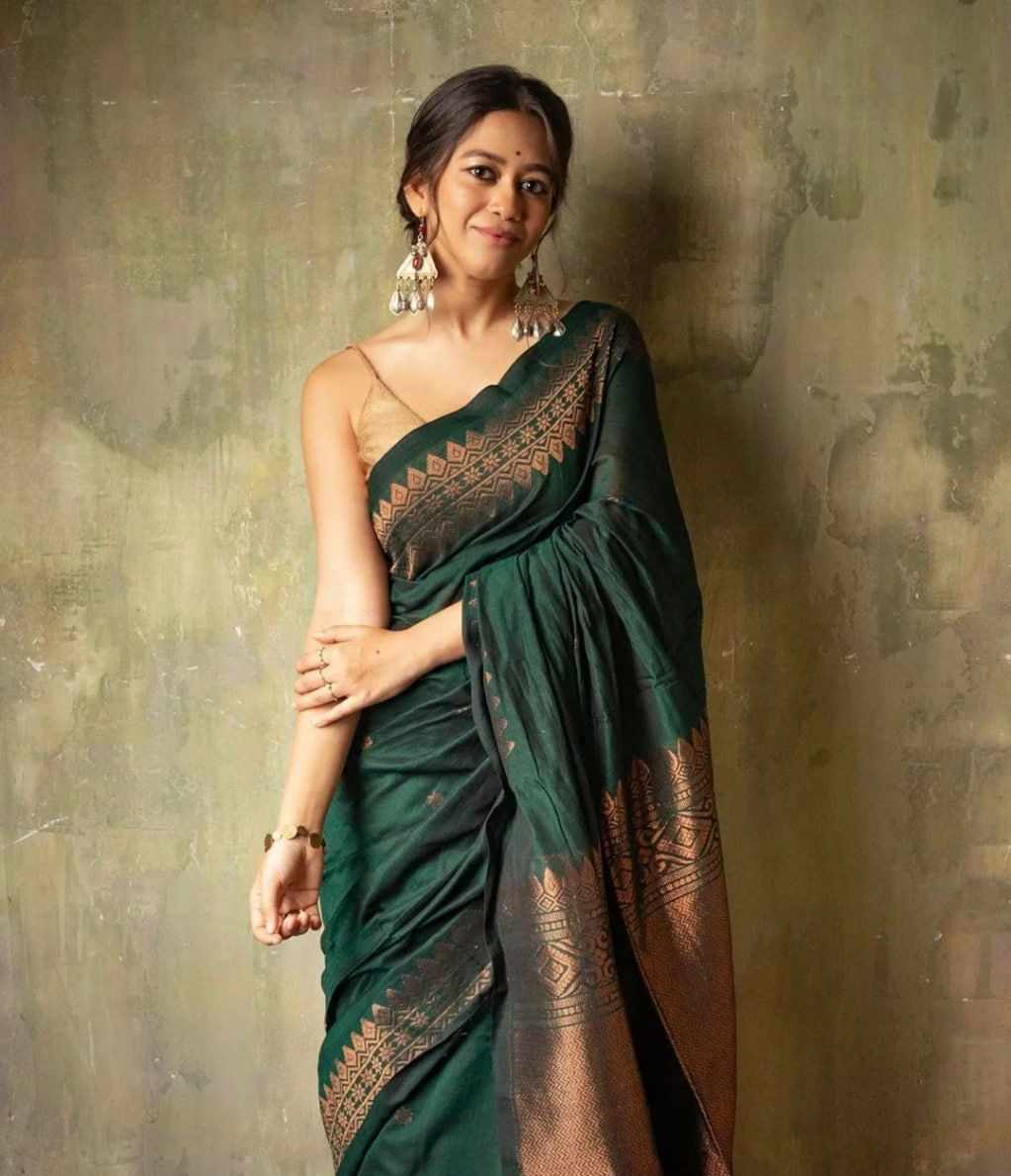 | Name : | MF 1950 GREEN BANARASI SOFT LICHI SILK SAREE |