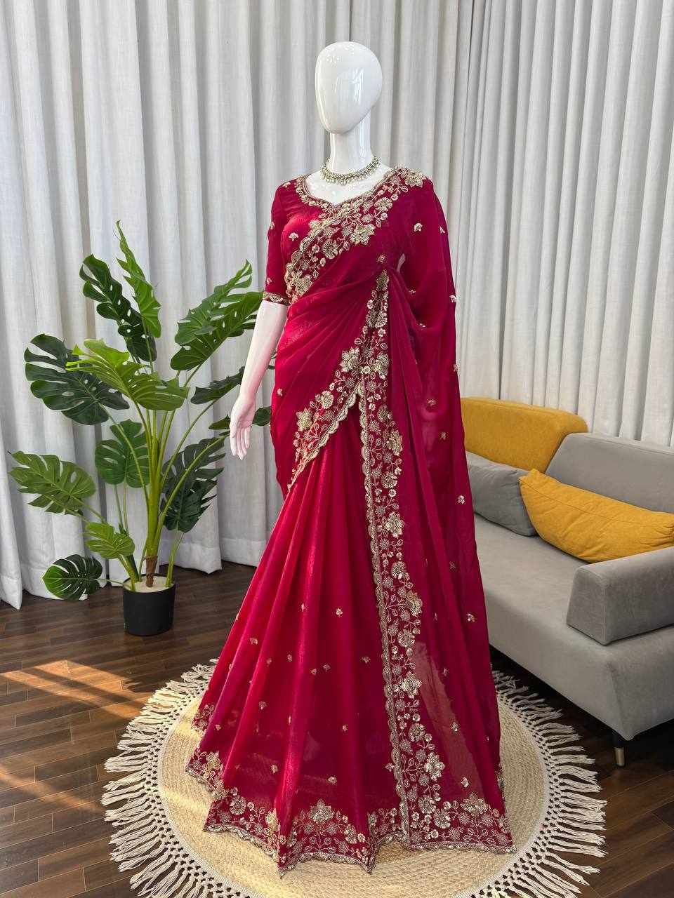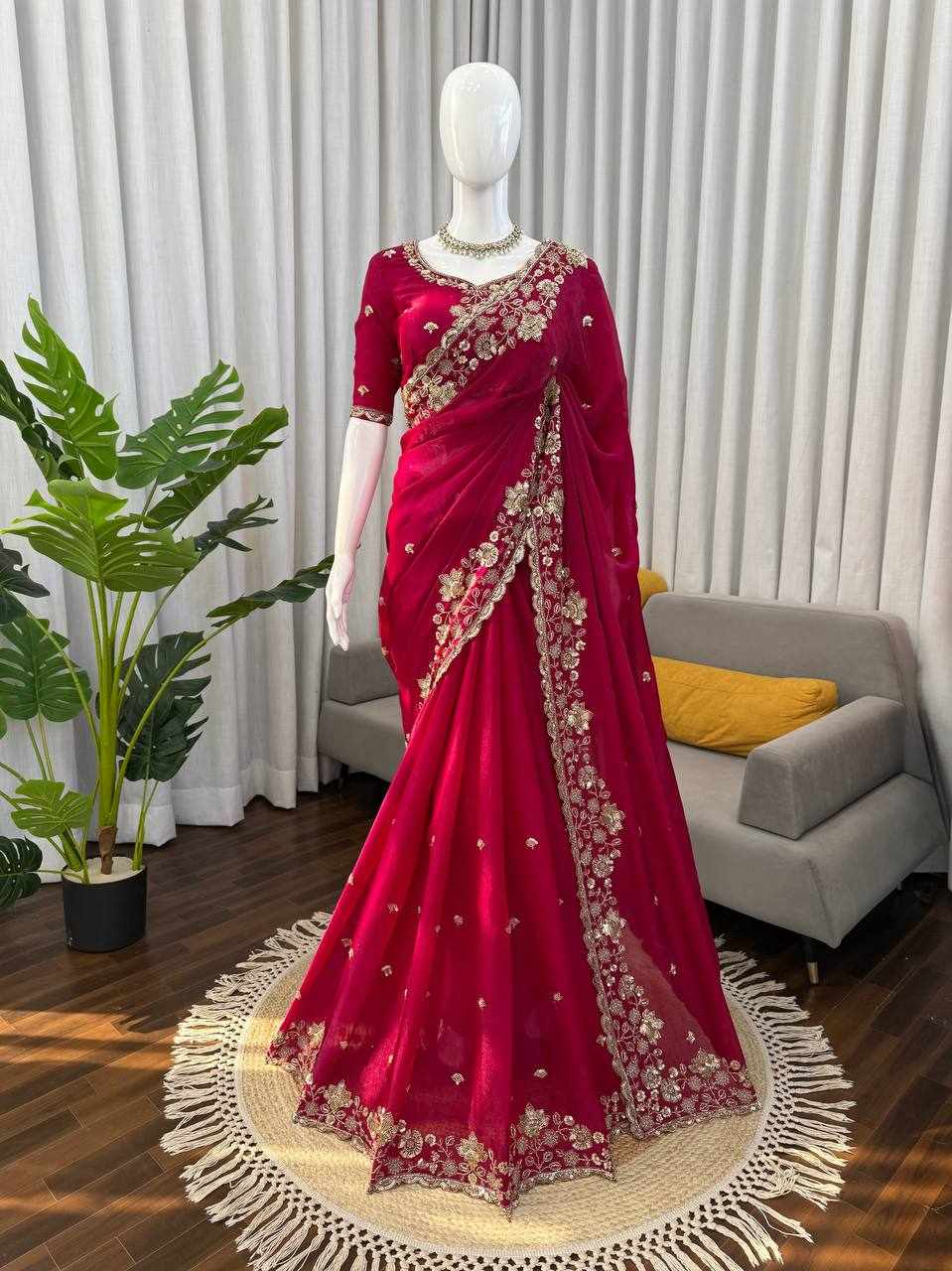 Fall in love with this stunning saree in an eye-catching shade, beautifully crafted with rich detailing and glamorous finishing. A perfect blend of grace and statement style for your special occasions.