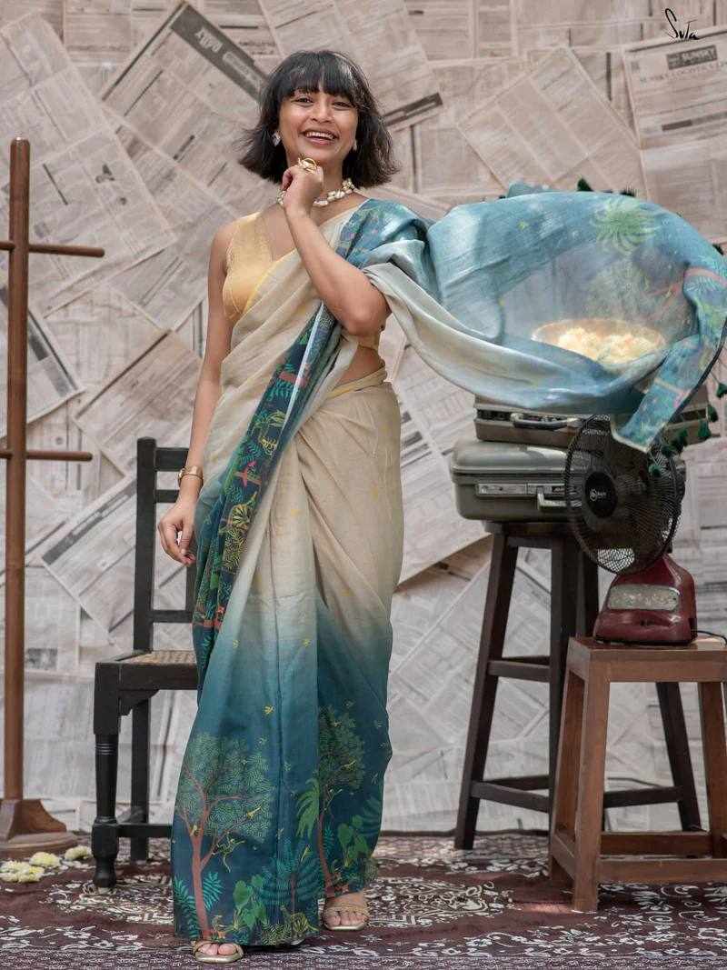 Saree Fabric: Soft Linen Cotton with beautiful digital print and elegant handmade cotton tassels